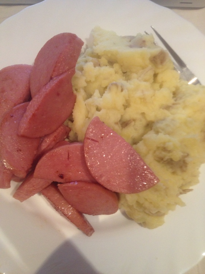 Jag håller på att tömma kylen så att det inte ska vara någonting kvar när jag åker till Sverige då jag också säkert kommer stänga av hela kylen - måste frysa av den... Mycket att fixas innan sverigeresan. Så ikväll blev det stekt falukorv med potatismos. Riktigt gott och svenskt!
